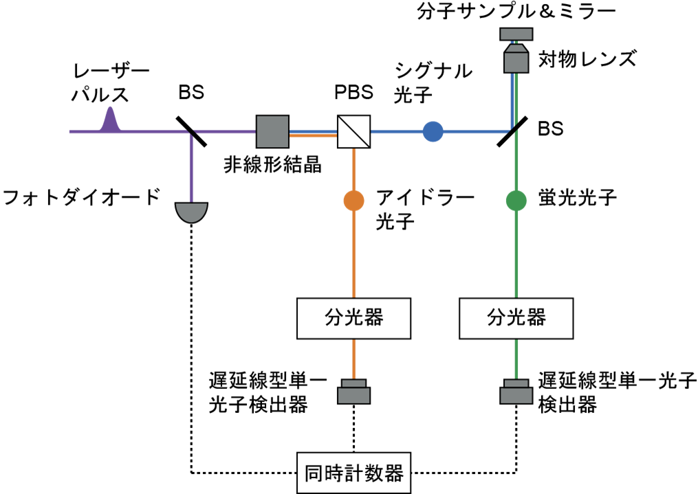 今回、研究チームは、既存の単一光子検出技術の範囲で実装可能な、量子もつれ光子対を利用した二次元蛍光分光法を理論的に提唱しました。本提案で想定する光学系の概略を図1に示します。まず、パルスレーザーを非線形結晶に入射し、自発的パラメトリック下方変換(注4) によって量子もつれ光子対を生成します。生成された光子対は偏光ビームスプリッター(PBS)で分離され、一方の光子(シグナル光子)は分子サンプルの励起に用いられます。サンプルから放出された蛍光光子と、もう一方の光子(アイドラー光子)との間で二光子同時計数検出を行います。ここで、遅延線型単一光子検出器(注5) と分光器を組み合わせることで、両光子の到着時刻と周波数を同時に計測します。